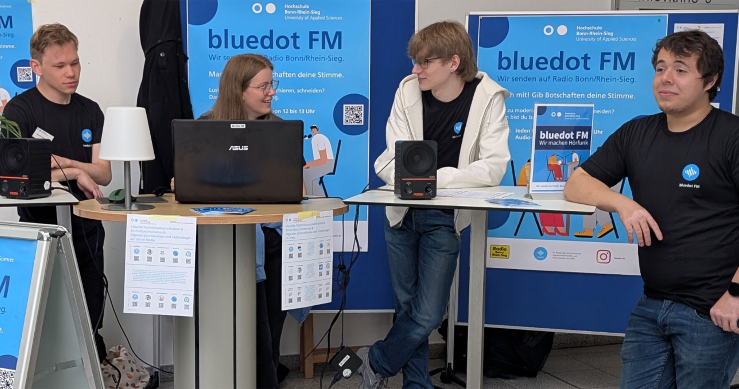 Auf dem Markt der Möglichkeiten präsentierten sich zahlreiche studentische Initiativen und Fachschaften den Erstsemstern. Das bluedot FM Team war dabei – sogar in eigenen Team-T-Shirts! Wir haben unsere Sendungen live laufen lassen und BesucherInnen eingeladen, bei uns vorbeizuschauen, mehr über unsere Arbeit zu erfahren und Teil unserer Radiowelt zu werden.